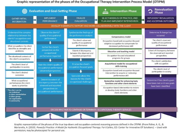 The OTIPM portrays the therapy process across three global phases—evaluation and goal setting, intervention, and reevaluation. Each step in this process may be OB, OF, or both (Fisher, 2013; Fisher & Marterella, 2019). Importantly, the OTIPM is not isolated: the Intervention Phase of OTIPM directly links the occupational therapy process to a variety of intervention models: compensatory, educational and teaching, acquisitional, and restorative approaches.