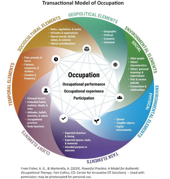 - Use the Transactional Model of Occupation to reason about the intertwined relationships among various elements of situational contexts and the elements of occupation: occupational performance, occupational experience, and participation.